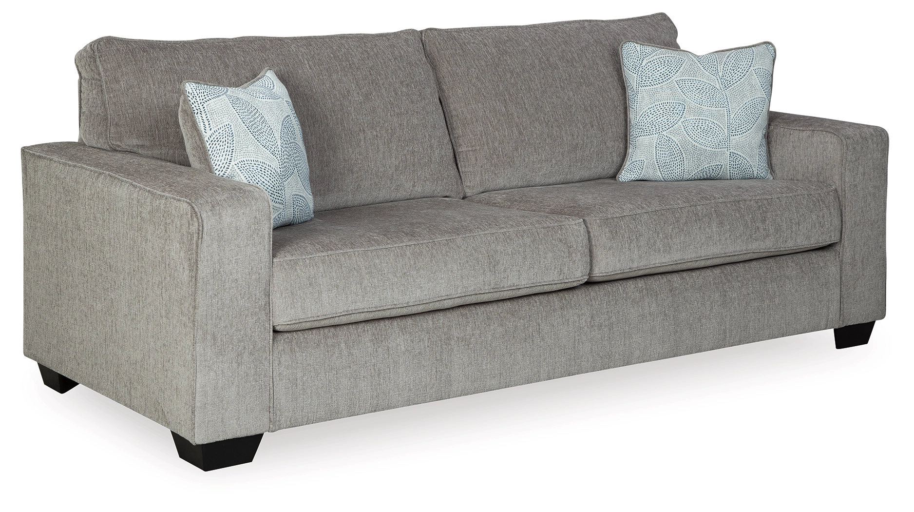 If style is the question, then the Altari sofa is the answer. Sporting clean lines and sleek track arms, the decidedly contemporary profile is enhanced with plump cushioning and a chenille-feel upholstery that’s so pleasing to the touch. Sure to play well with so many color schemes, this sofa in richly neutral alloy includes a pair of understated floral pattern pillows for fashionably fresh appeal.